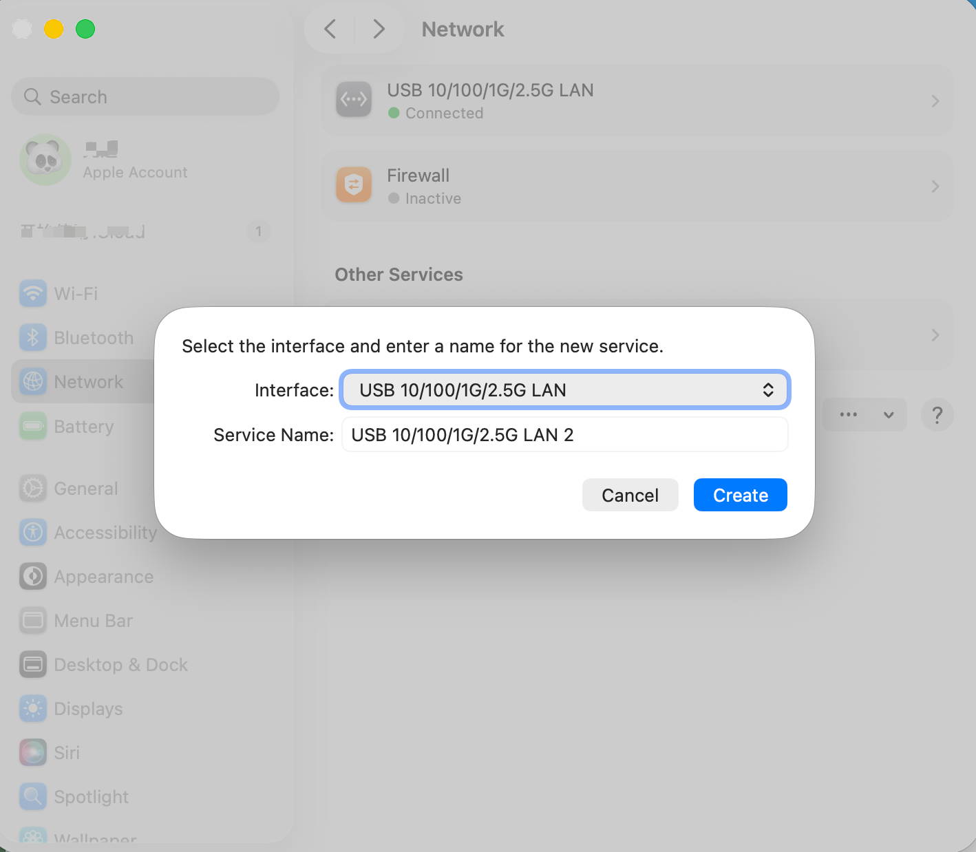 Schritt 4: Wählen Sie „Dienst hinzufügen” aus der Dropdown-Liste und wählen Sie „USB 10/100/1G/2,5G LAN” als Schnittstelle und „USB 10/100/1G/2,5G LAN” als Dienstnamen. Klicken Sie dann auf die Schaltfläche „Erstellen”. Warten Sie 5–10 Sekunden, bevor Sie überprüfen, ob der Verbindungspunkt grün wird, was bedeutet, dass eine Verbindung erkannt wurde. Wenn der Punkt grün wird, testen Sie das Netzwerk. Wenn das Problem weiterhin besteht, fahren Sie mit Schritt 5 fort, um „Energieeffizientes Ethernet“ zu deaktivieren.
