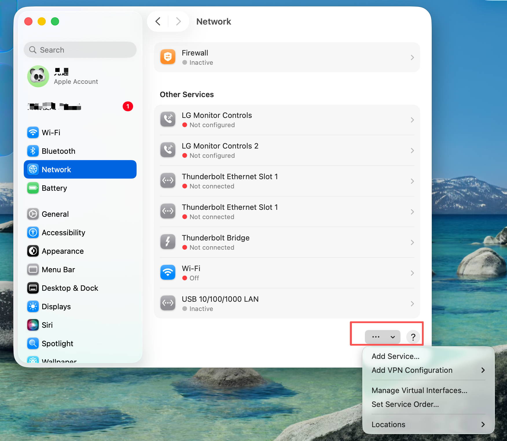 Schritt 3: Erstellen Sie einen neuen Netzwerkdienst, der mit dem Thunderbolt-Dock verbunden ist, indem Sie auf die Schaltfläche „… ⌵“ klicken.