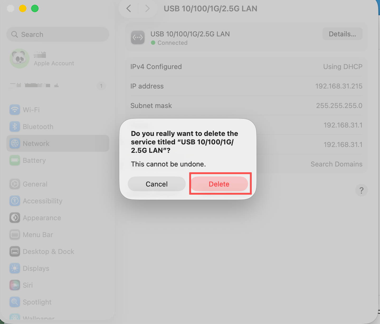 Schritt 2: Entfernen Sie alle aktuellen und nicht verwendeten „USB 10/100/1G/2.5G LAN”-Verbindungen, die mit dem Dock verbunden sind. Klicken Sie dazu in der Liste auf „USB 10/100/1G/2.5G LAN”, klicken Sie auf „Dienst löschen…” und dann auf die Schaltfläche „Löschen”. Wiederholen Sie diesen Vorgang für alle Einträge „USB 10/100/1G/2,5G LAN“.